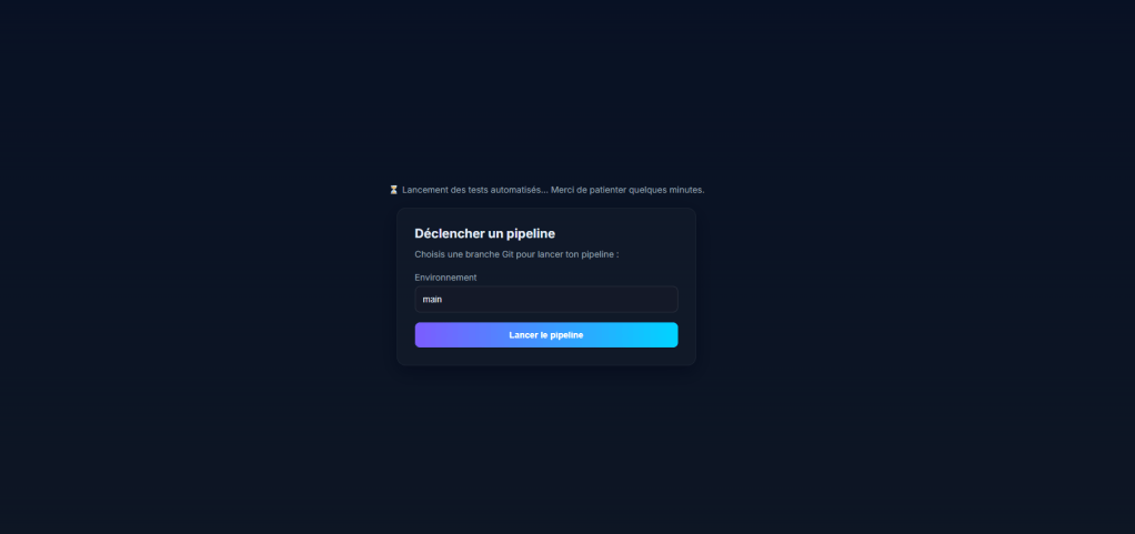 Une fois la fonction appelée dans submitForm() et la page relancée votre pipeline job se lancera tout seul sur Gitlab, vous pourrez alors suivre son avancée directement sur l’IHM. L’application étant pour l’équipe fonctionnelle il faudra quand même penser a mettre à jour le statut du lancement sur notre page afin que l’équipe puisse suivre sans avoir a aller directement sur Gitlab.