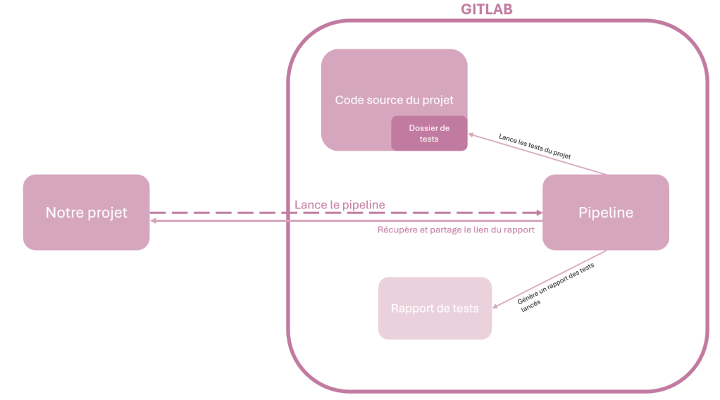 Ce projet est déployé via un pipeline Gitlab et contient un ou plusieurs jobs de tests. Ces jobs lancent des commandes en ligne afin de lancer les tests et de générer des rapports concernant ceux ci.